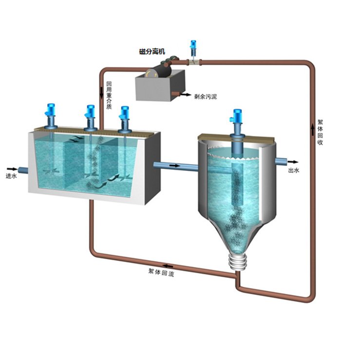 磁介質混凝沉澱采用一種極速混凝沉澱技術,通過投加磁介質粉爲絮凝核,加速高濃度和大密度絮體的形成,起到壓載或加重作用以加速沉澱過程,大幅提高絮體的沉降速度,提高去除效果和單位水池的效率;是新一代沉澱澄清技術、除磷技術和深度處理新技術,具有超快的沉澱速度、優良的沉澱效果和除磷效果。